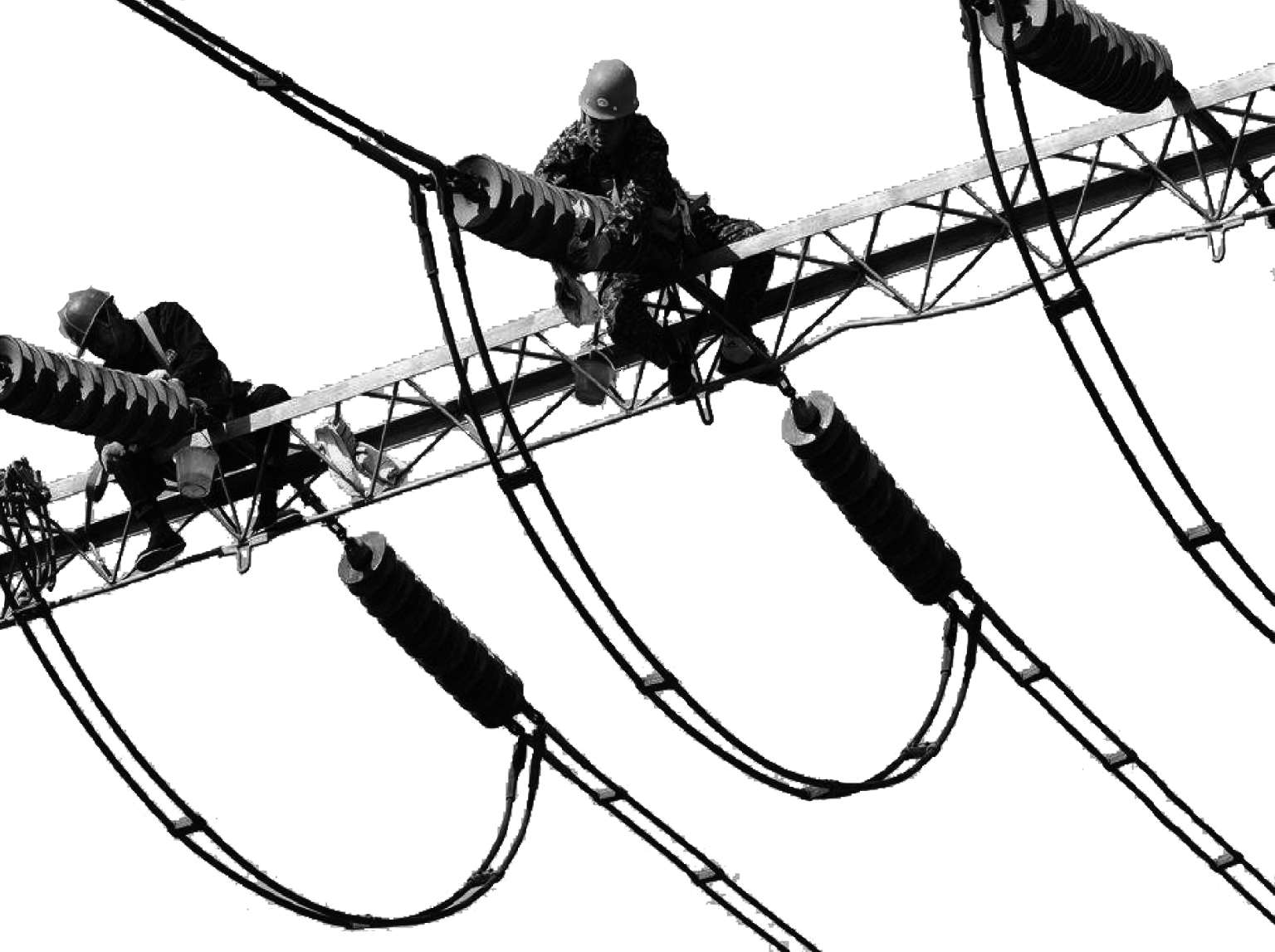 在线路杆塔、变电站进线端作业时,应采取防感应电措施,必要时应穿屏蔽服,加挂接地线,使用个人保安线。高压专业参数测试人员必须使用绝缘手套、绝缘靴、绝缘垫,拆、接引线前,线路必须接地,如图1-34 所示高空高压线路作业时容易产生感应电,工作人员须做好防护措施。