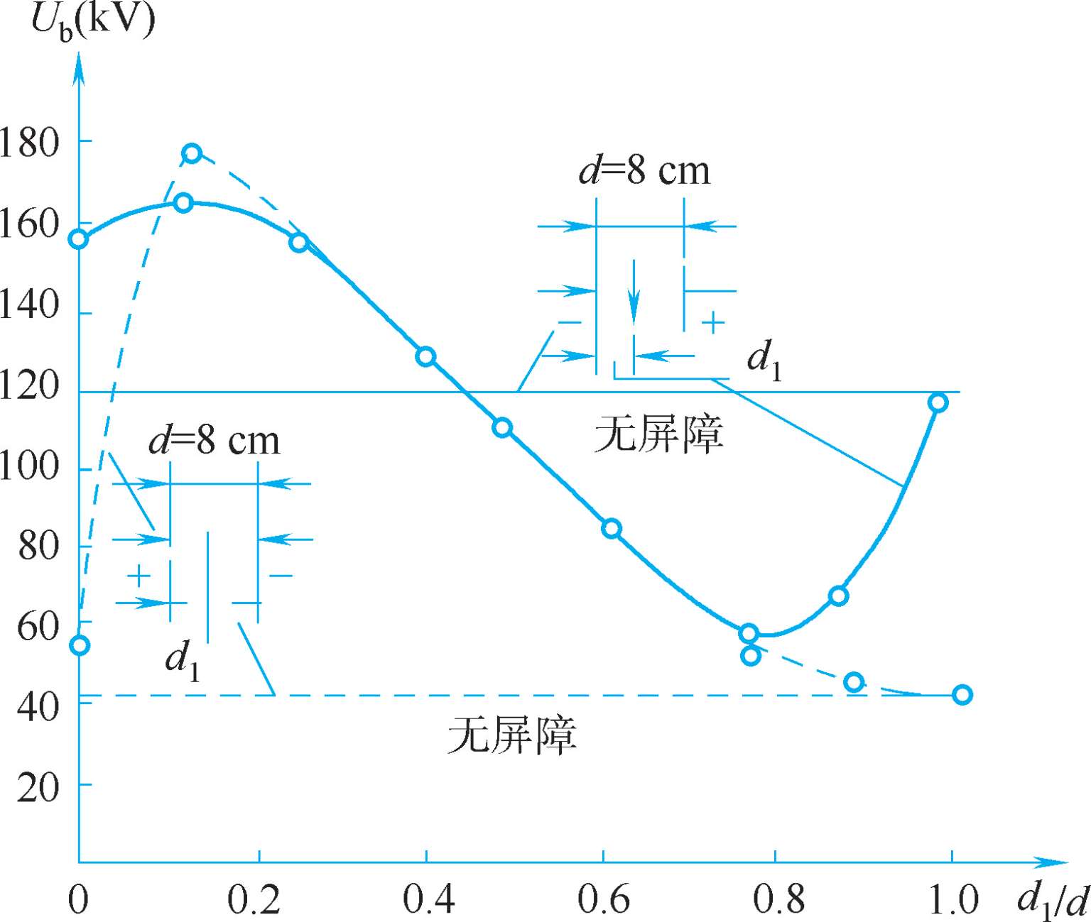 图1-39 直流电压下尖—板空气间隙的击穿电压和屏障位置的关系