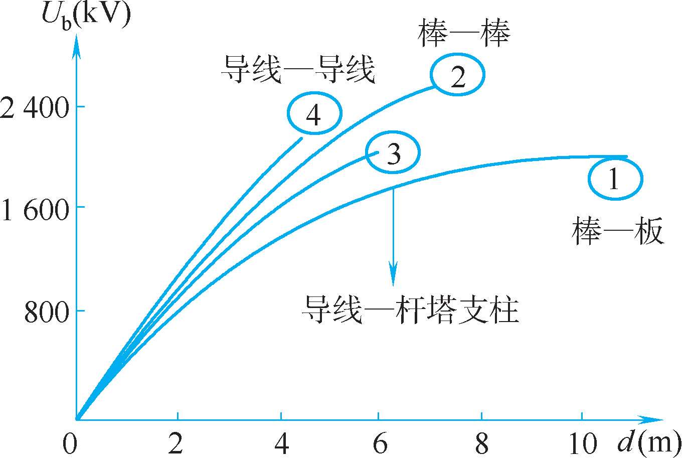 在高压电气设备制造时,就会遇到气体绝缘间隙问题。从绝缘角度上说,间隙当然是越大越好,但是从材料和空间来说,希望减小设备尺寸,间隙的距离尽可能缩短。为此需要采取措施,以提高气体间隙的击穿电压。长空气间隙不同电场下的交流击穿电压,如图1-37 所示。