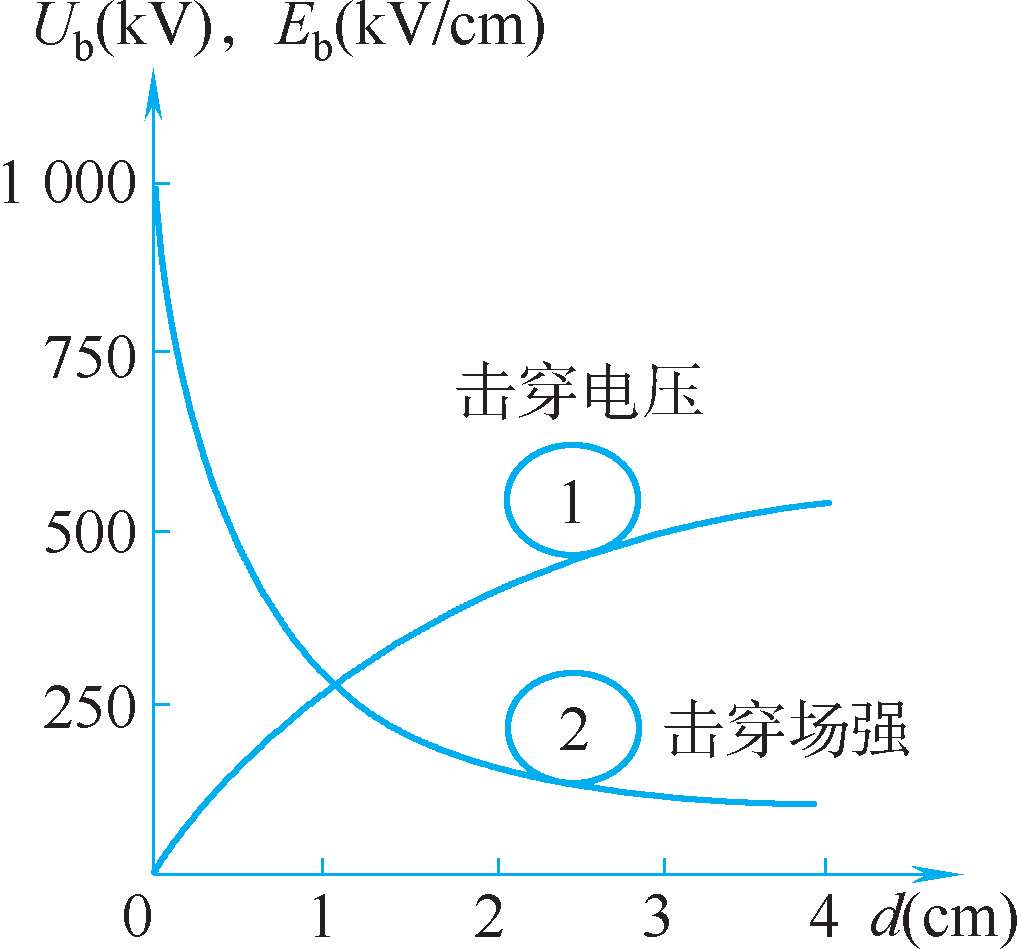 通常情况下,气体中有少量带电离子是良好的绝缘介质,但当电场较弱时,气体电导极小,可视为绝缘体。在强电场作用下,沿电场方向移动时,在间隙中会有电导电流。当气体间隙上电压提高至一定值后,可在间隙中突然形成一传导性很高的通道,此时称气体间隙击穿,也就是气体放电,气体由绝缘状态变为导通状态,失去绝缘的性能。使气体击穿的最低电压称为击穿电压。均匀电场中,击穿电压与间隙距离之比称为击穿场强,它反映气体耐受电场作用的能力,即气体之电气强度。不均匀电场小,击穿电压与间隙距离之比称为平均击穿场强。击穿电压与击穿场强的关系如图1-36 所示。