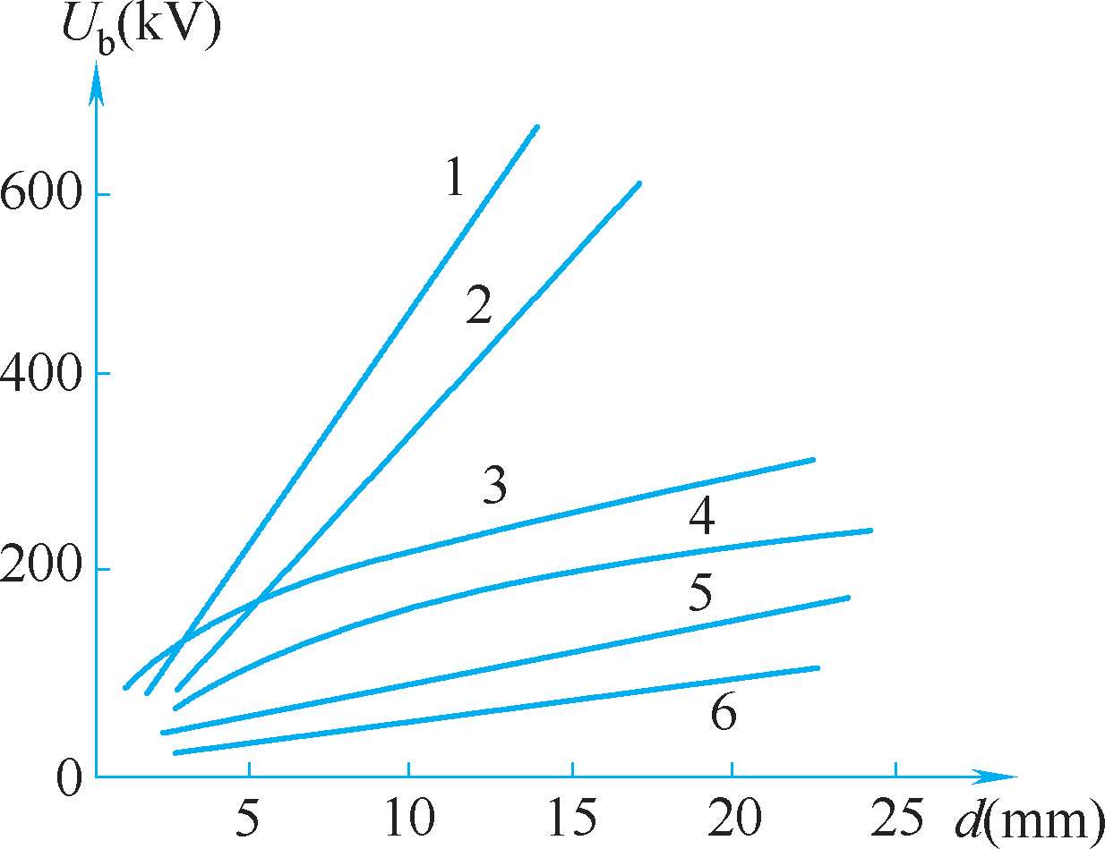 图1-40 均匀电场中几种绝缘介质的击穿电压与距离的关系