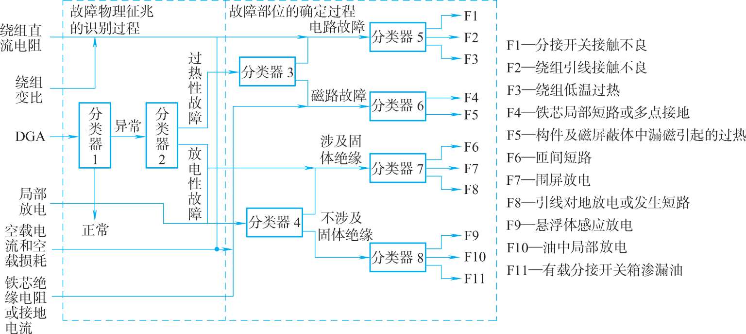 变压器故障诊断中应综合各种有效的检测手段和方法,对得到的各种检测结果要进行综合分析和评判,变压器常规故障综合诊断如图2-1 所示。