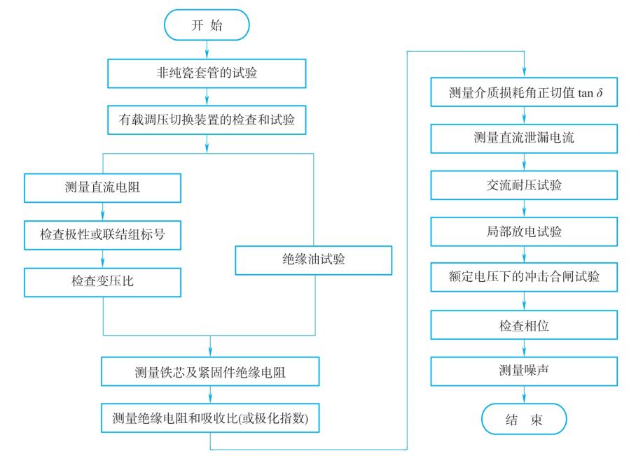 综合上述试验项目,试验流程如图2-2 所示。表2-1 是 110 kV油浸式变压器试验规程项目。