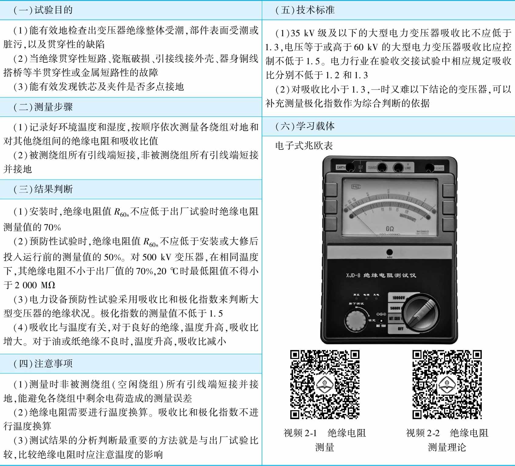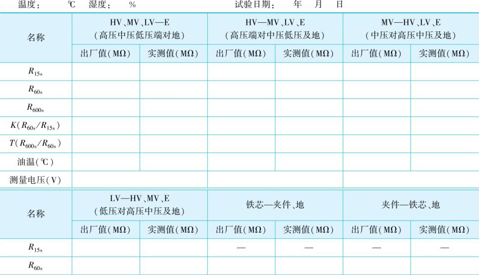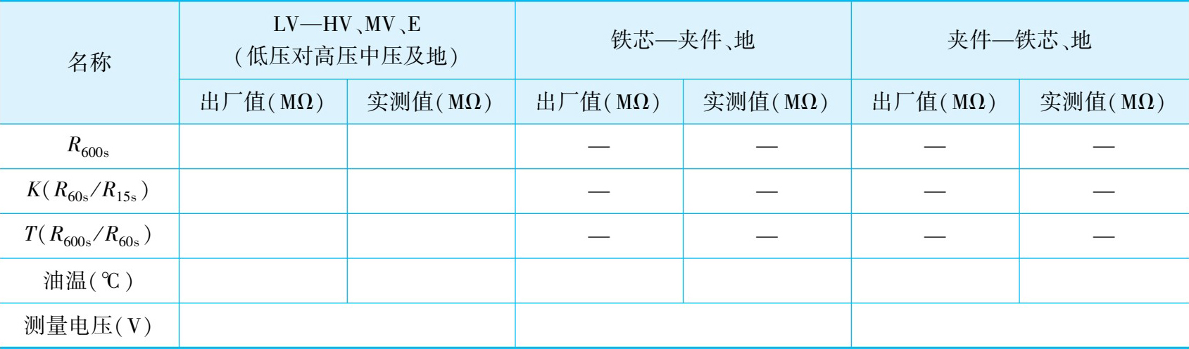 测量绕组绝缘电阻时,对额定电压为 1 kV及以下的绕组,应使用量程不高于 0.5 kV的兆欧表,电压为 2.5 kV及以上的绕组可用 1 kV或 2.5 kV的兆欧表。对额定电压为 10 kV及以上的绕组采用 5 kV绝缘电阻表测量并记录顶层油温。