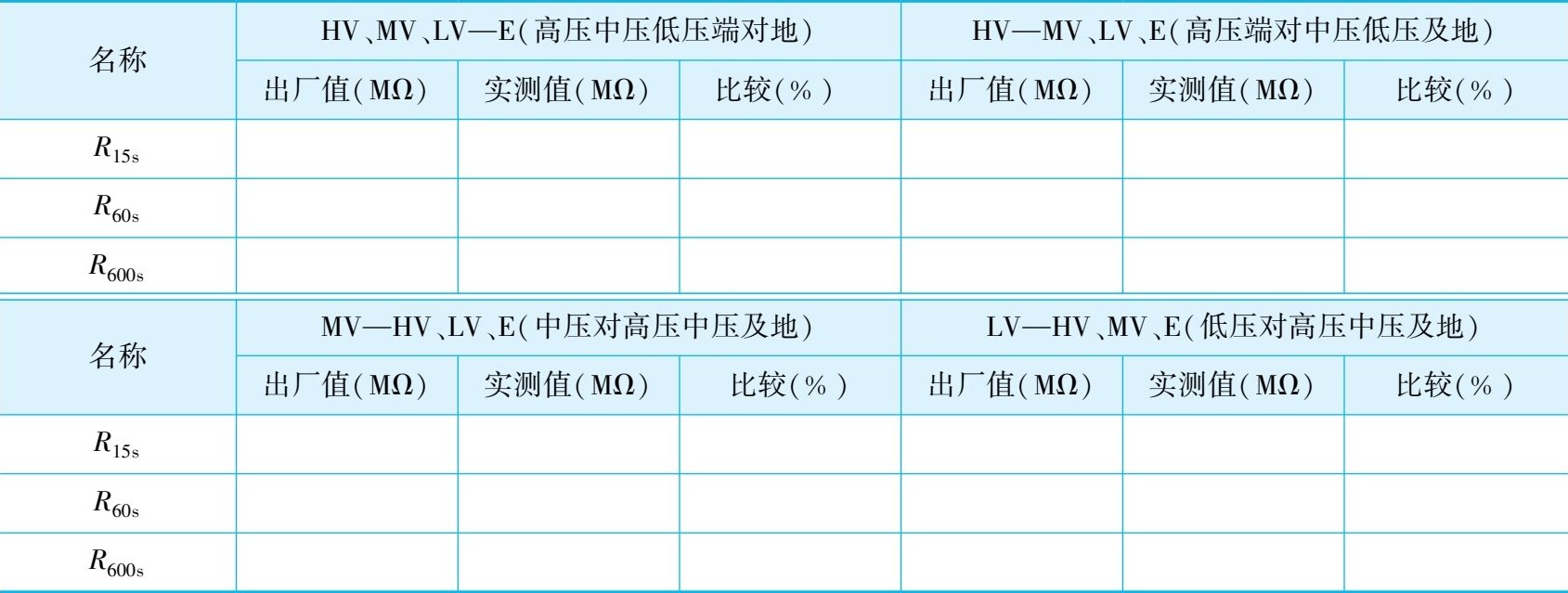(2)测量时非被测绕组(空闲绕组)所有引线端短接并接地,目的是测量被测部分对接地部分和不同电压部分间的绝缘状态,且能避免各绕组中剩余电荷造成的测量误差。实测表明,测量绝缘电阻时,非被测绕组接地比接屏蔽时其测量值普遍低一些。