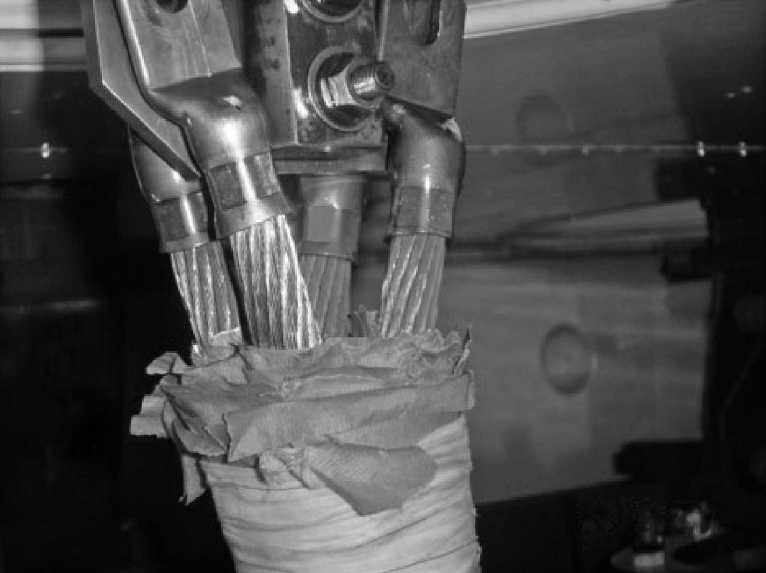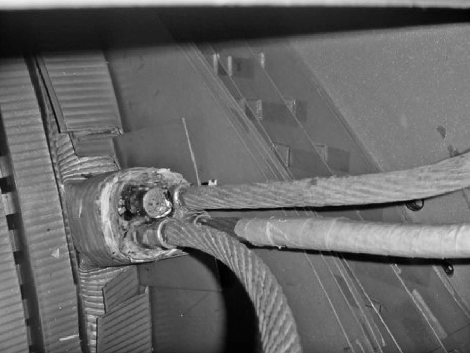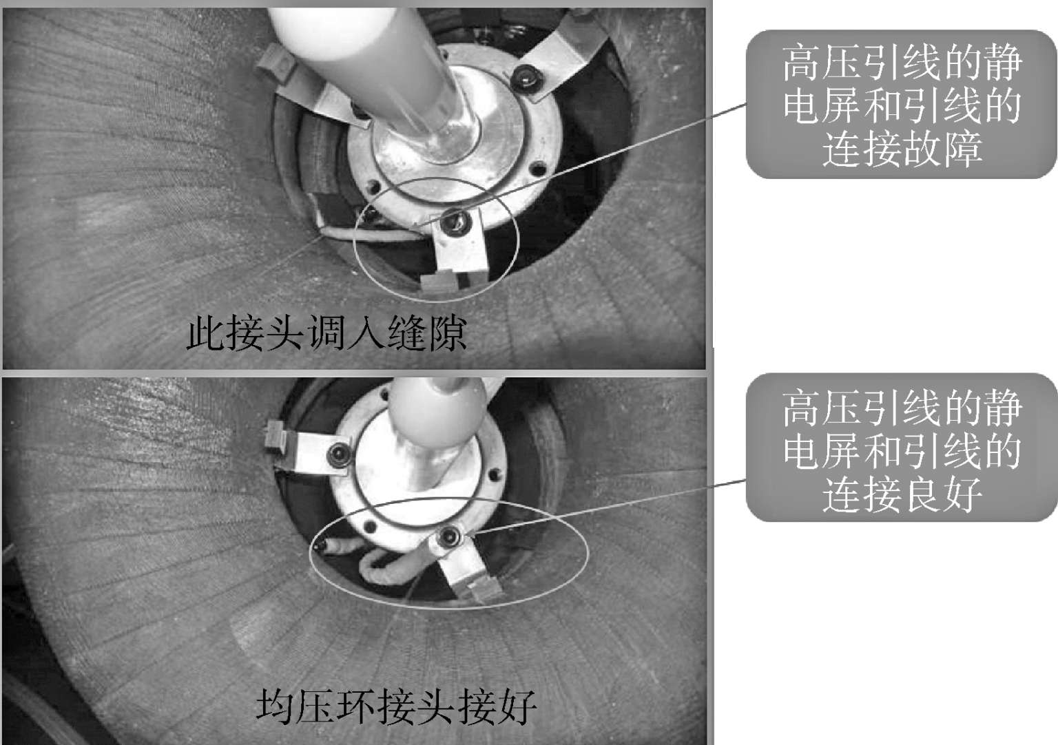 如图2-6 所示,直流电阻试验检测出 1 号变压器B相高压引线(连接高压套管端)有三根过热发黑。如图2-7 所示,直流电阻试验检测出 1 号变压器B相高压引线(连接高压套管端)有一根已经烧断。如图2-8 所示,直流电阻试验发现在高压引线连接故障对比图,说明接头掉缝隙与接头良好对比。