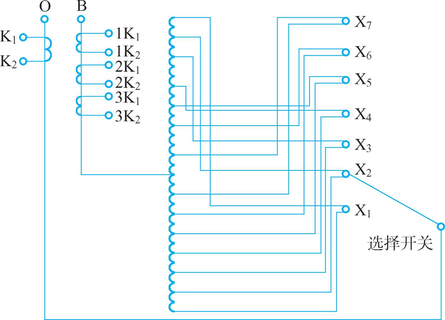 经过多次转换分接开关再进行测量,直流电阻不平衡系数仍大于《试验规程》规定,绕组接线示意如图2-9 所示。当进行色谱分析时,却未发现异常。为了查明不平衡系数超标的原因,将变压器油放掉后测量直流电阻,测量结果见表2-9。