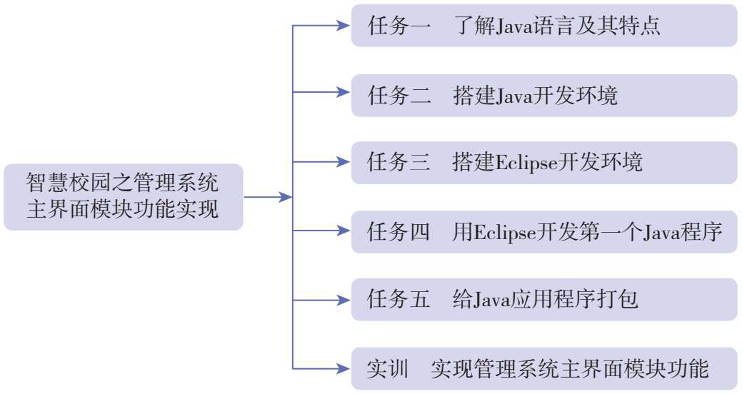 随着数字化、信息化的不断发展,应用大数据、云计算、物联网等技术进行信息化校园管理的智慧校园管理系统应运而生,能有效实现校园的教育、管理、服务的一体化。本项目通过了解Java语言的特点、开发运行环境等知识与技能,使学生熟悉Java应用程序是如何一步一步开发出来的,从而学会如何对一个应用程序进行功能分析,并利用Java基本的输出语句,实现智慧校园管理系统主界面的设计。具体任务列表如下: