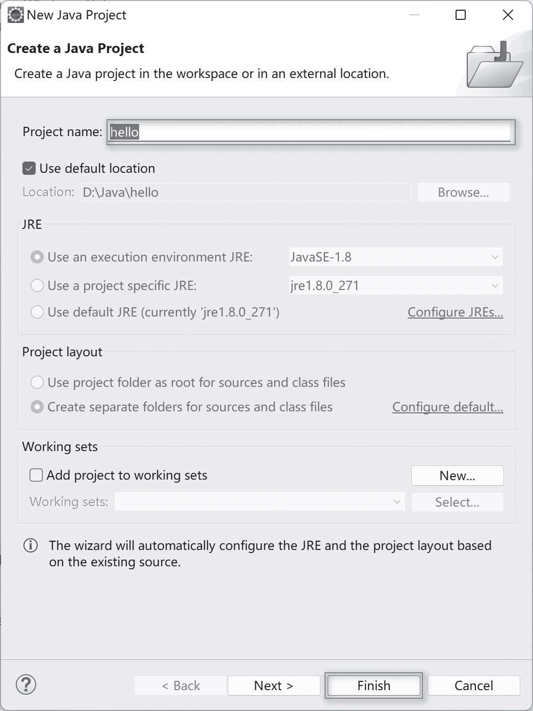 (2)在Project name文本框中输入工程名字:hello,其他部分选项暂不修改,然后单击Finish按钮,即可创建一个名字为hello的Java工程。