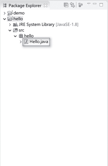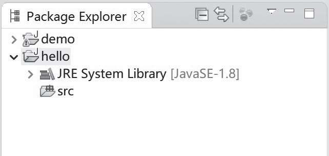 其中根节点hello为工程名,其下src文件夹为工程内部的源文件夹。当然,目前还没有创建任何Java文件,所以src目录为空。JRE System Library是要开发和运行Java程序所需的一些资源文件。