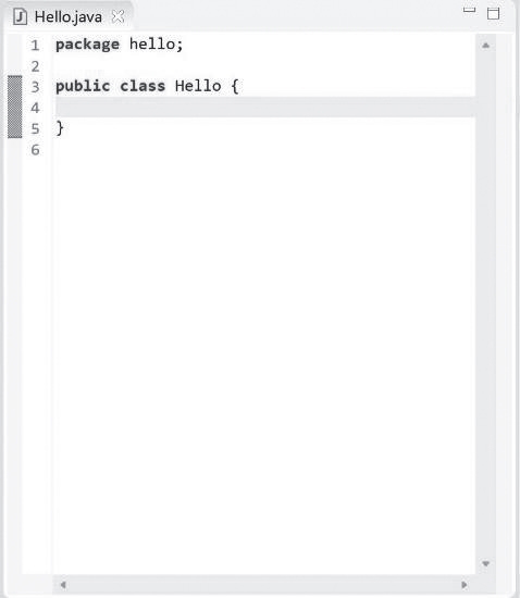 此时,会发现src目录下已经多了一个Hello.java的文件,并且Eclipse中间的源代码部分也变成编辑状态,如图1-24所示。