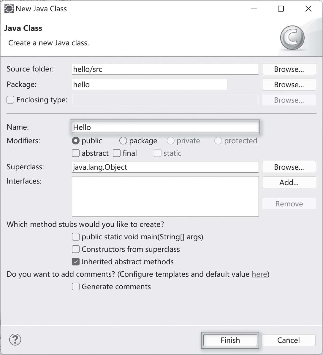 接着开始创建Java文件,选择“File”→“New”→“Class”命令,新建一个Java源文件,我们称为一个“类”。打开New Java Class对话框,如图1-23所示,在Name文本框输入类名:hello,其他选项不做改动,单击Finish按钮。