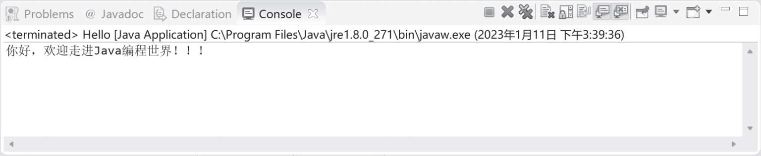 ,选择“Run as”→“Java Application”命令,运行Hello.java程序,控制台输出的结果如图1-26所示。