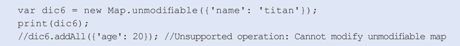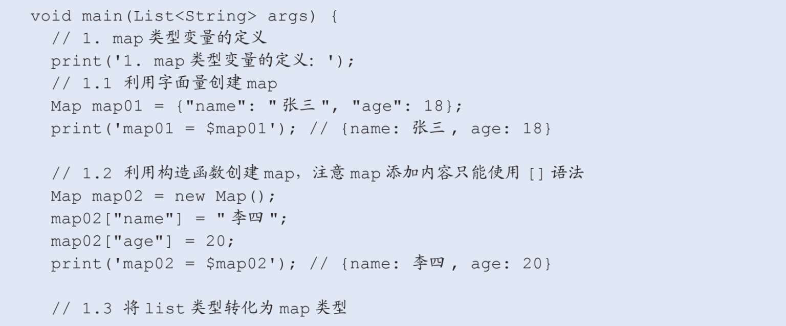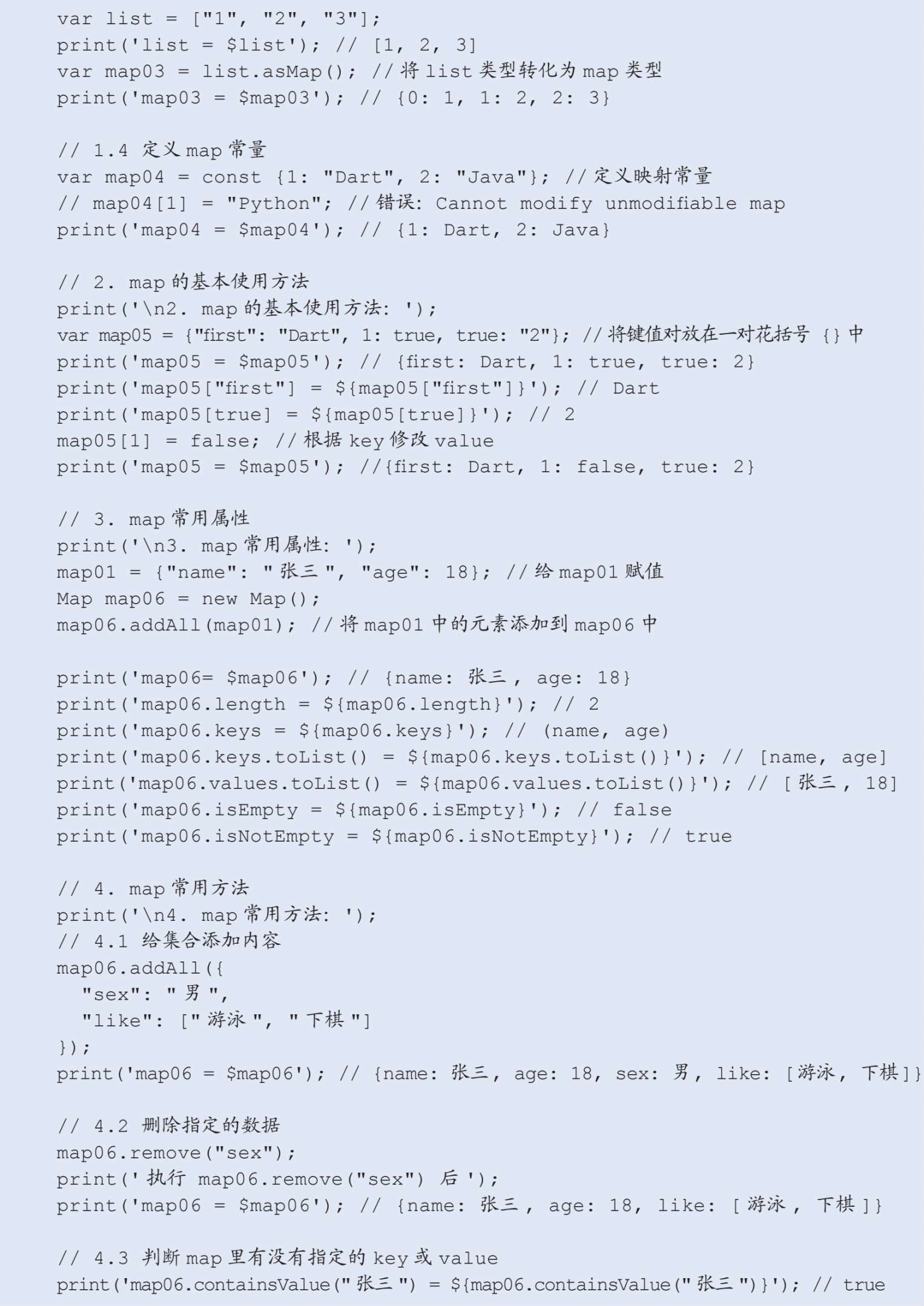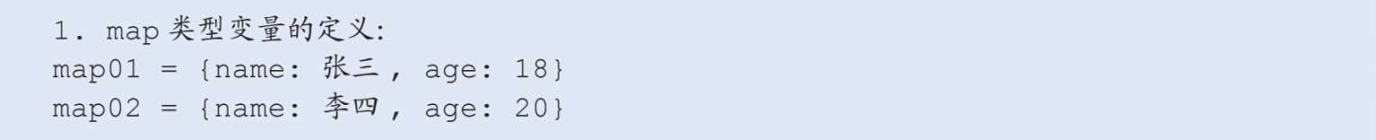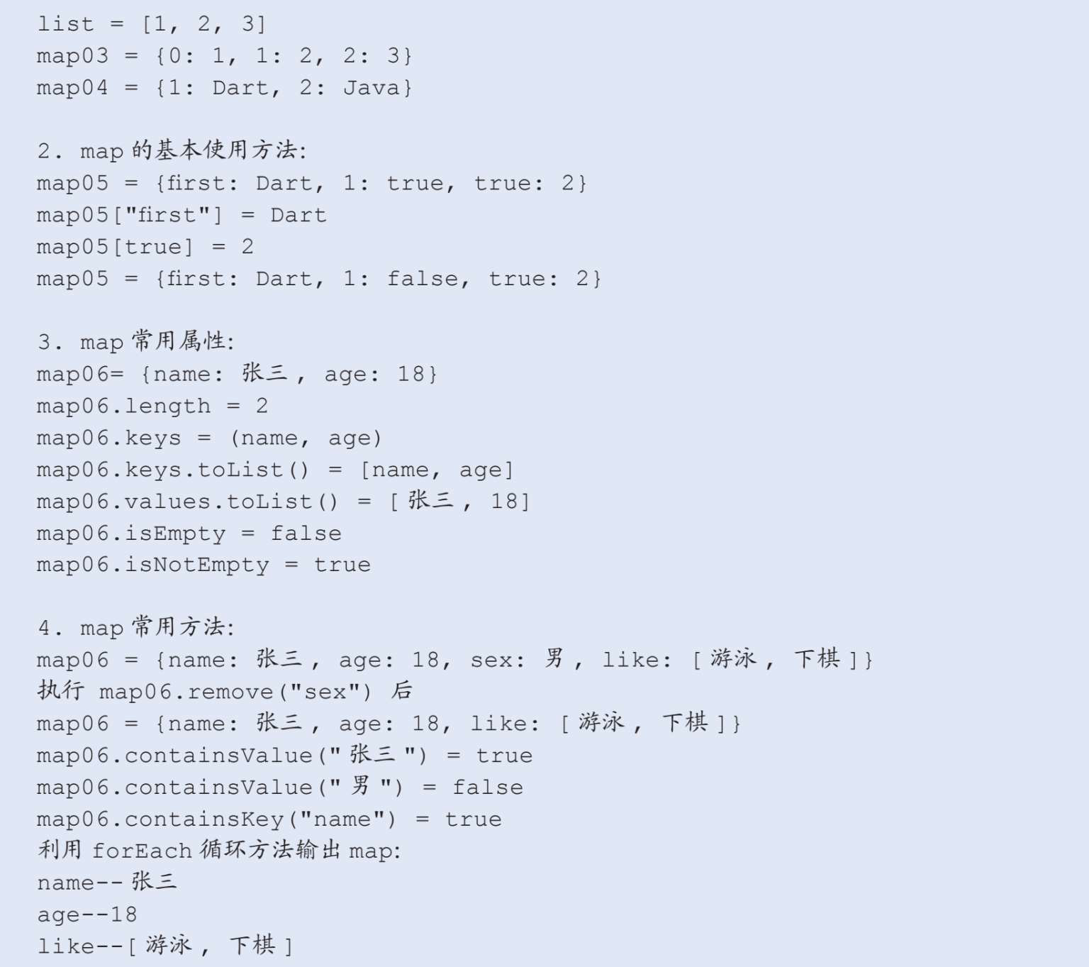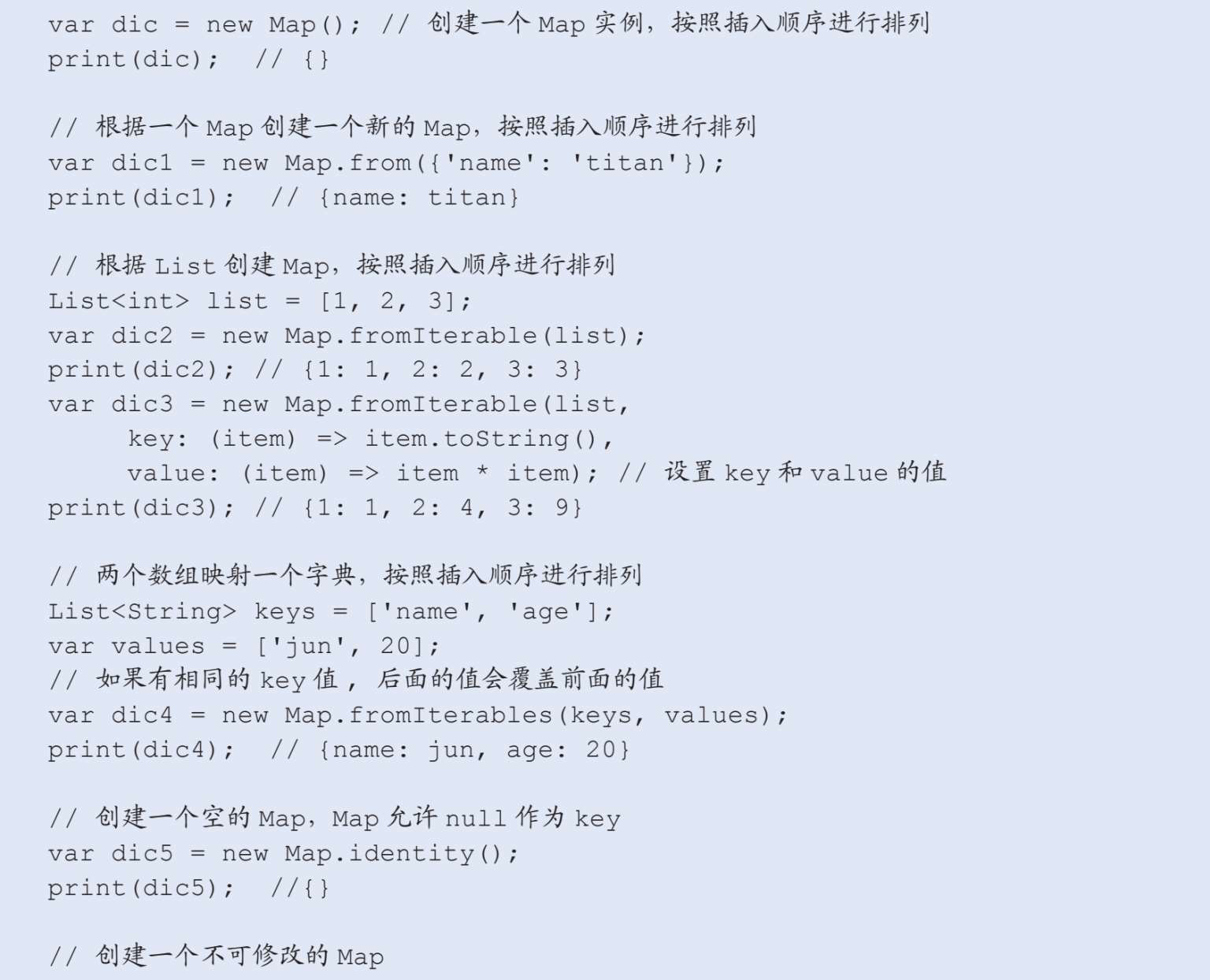 (2)可以通过两种方式声明Map:使用Map字面量和使用Map构造函数,使用Map字面量是通过将键值对放在一对花括号 { }中来实现。创建Map类型变量示例如下: