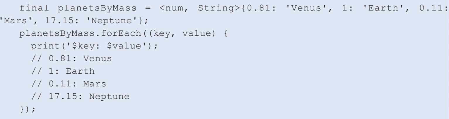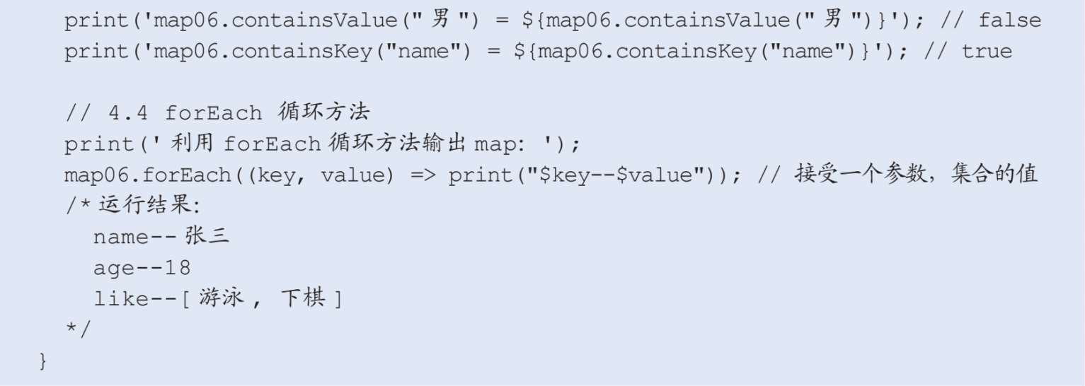 ⑥ void forEach(void Function(dynamic, dynamic) action):将action应用于Map的每个键值对。示例如下:
