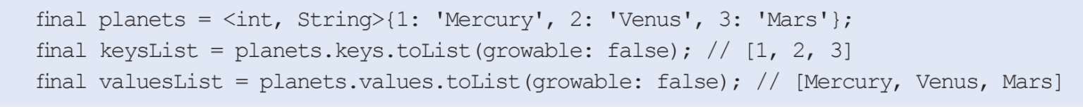 ① List<dynamic> toList({bool growable = true}):将Map中的所有key或value转化为列表。示例如下: