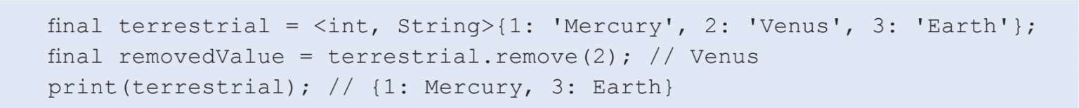 ⑤ dynamic remove(Object? key) :从Map中删除键及其关联值(如果存在)。示例如下: