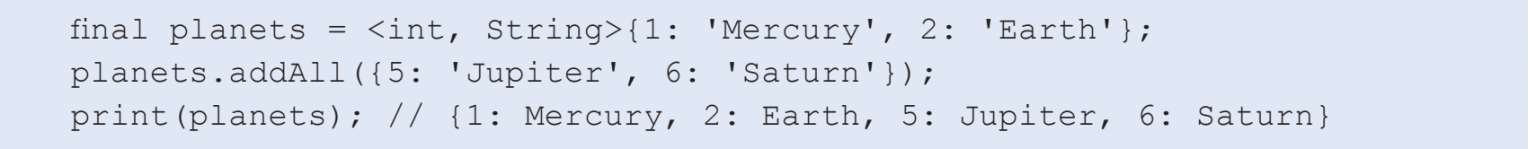 ④ void addAll(Map<dynamic, dynamic> other):向此映射添加其他所有键值对。示例如下: