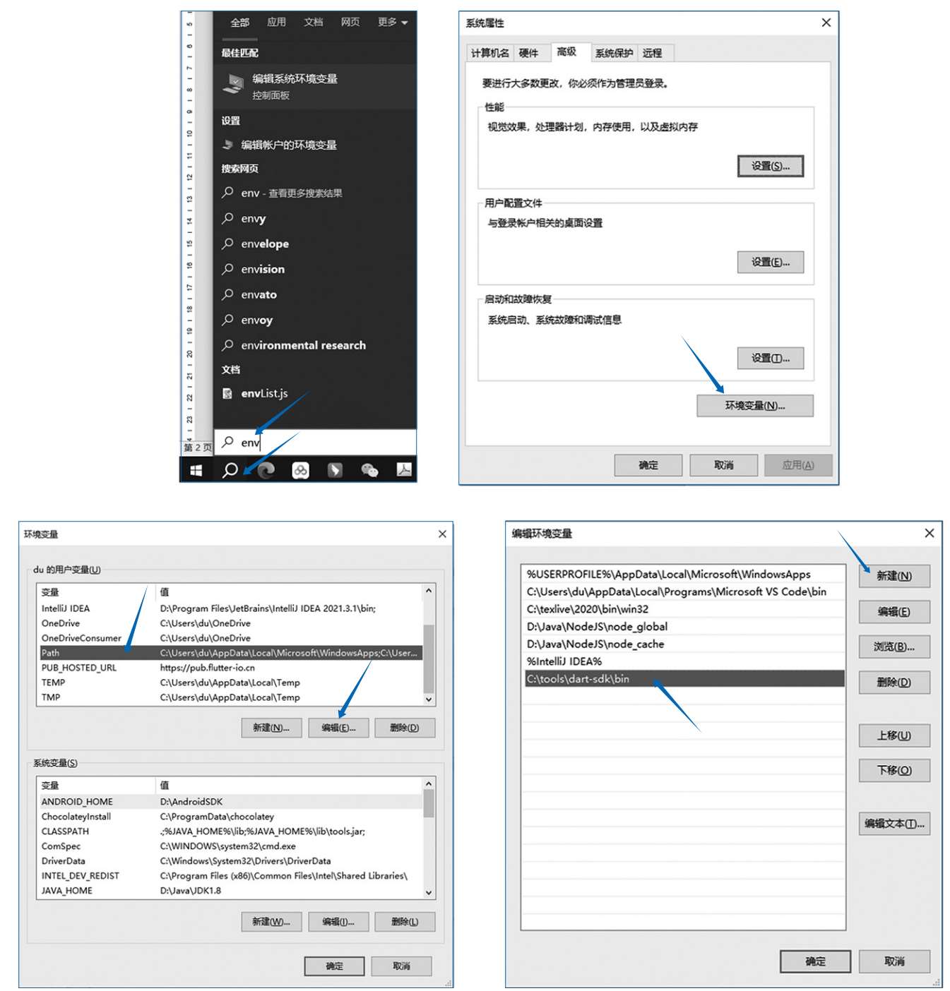 (2)安装SDK。下载完成后,直接将压缩包解压到相应文件夹中,然后将文件夹dart-sdk添加到环境变量Path中,方法如下:在Windows操作系统左下角的搜索框中输入env,在弹出的“系统属性”对话框中单击“环境变量”按钮,在弹出的“环境变量”对话框中的“用户变量”中选择Path变量,然后单击下面的“编辑”按钮,在弹出的“编辑环境变量”对话框中单击“新建”按钮,然后将dart-sdk文件夹添加到环境变量中,添加过程及结果如图1.2 所示,最后单击各个对话框的“确定”按钮即可。