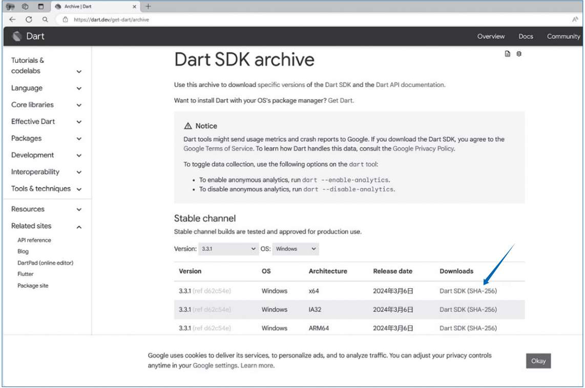 (1)下载Dart SDK。下载地址:https://dart.dev/get-dart/archive。