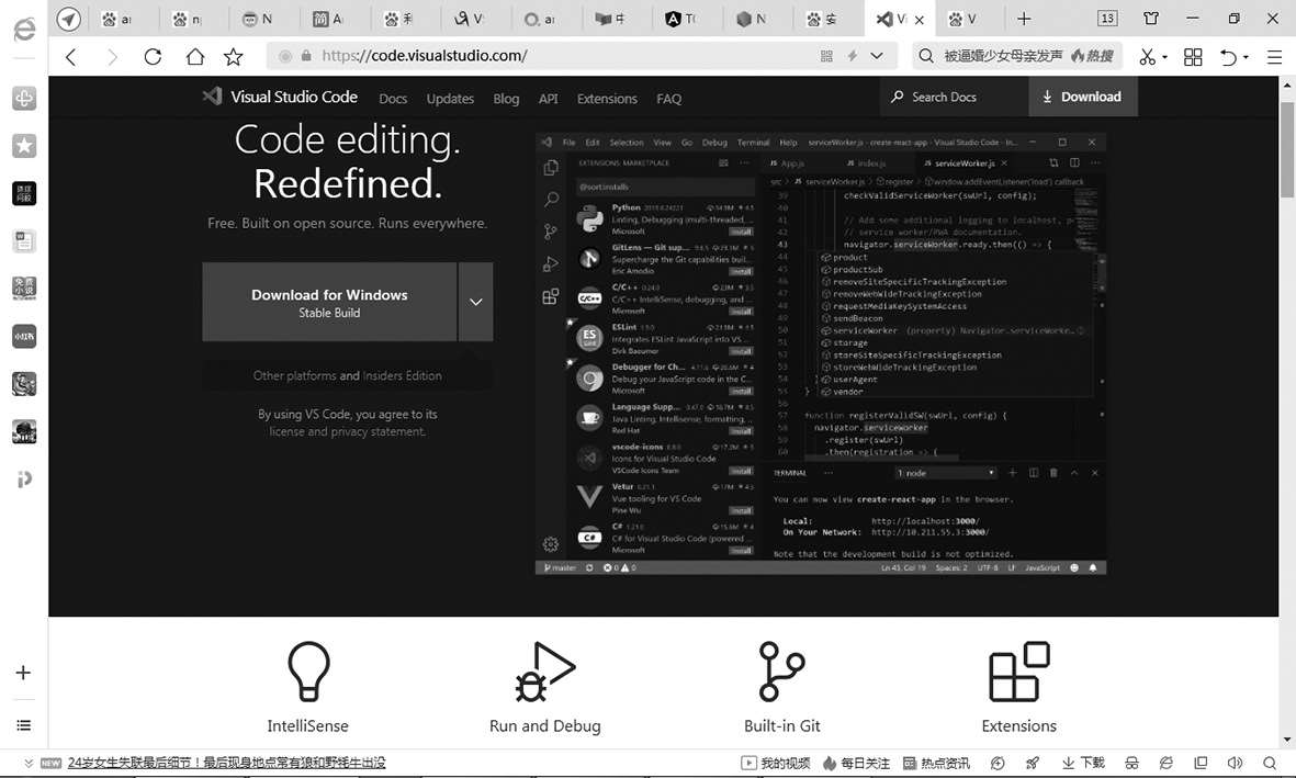 (1)下载。打开VS Code的官网:https://code.visualstudio.com/ ,如图1.5 所示,根据操作系统版本直接下载即可。