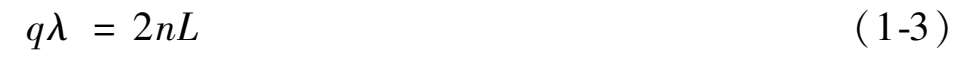 式中, λ 为激光波长, n 为激活物质的折射率, L 为光学谐振腔的腔长, q 为纵模模数,取值范围是有限个正整数。由于受激辐射光只在沿谐振腔轴向方向(纵向)形成驻波,因此称为纵模。当 q 不同时,可能有不同的波长值,即有若干个谐振频率。当 q = 1 时,为单纵模;当 q > 1 时,为多纵模。