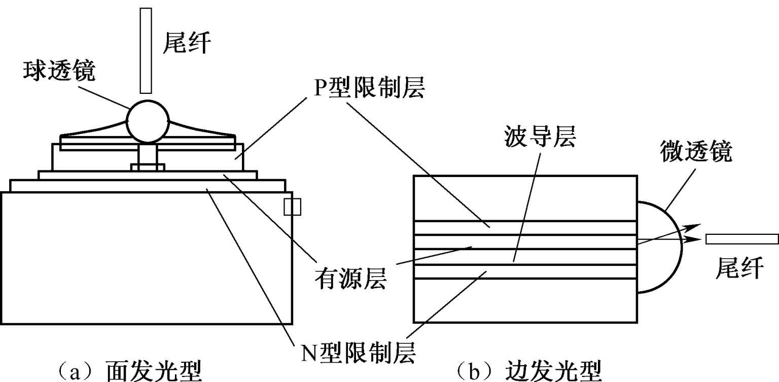 可见,光与物质相互作用时,发射或吸收光子的波长取决于材料的禁带宽度。不同材料的禁带宽度有所不同。GaAlAs-GaAs半导体材料的禁带宽度为 1.47 eV,这种材料制成的光源发射光的波长为 0.85 μm。若要产生 1.31~1.55 μm的发射光,则需要使用禁带宽度在 0.8~0.96 eV之间的InGaAsP-InP材料。