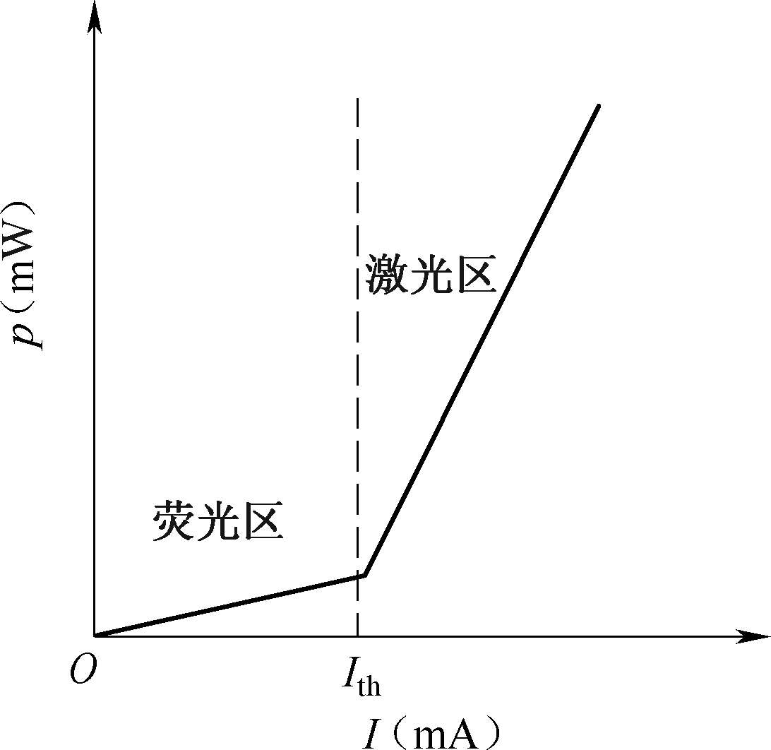 半导体LD的 P-I 曲线如图1-30 所示。从曲线可以看出它有一个“拐点”,对应的电流称为阈值电流 I th 。为使激光器稳定工作,阈值电流越小越好。当注入电流小于阈值电流时,激光器处于自发辐射状态,发出的是荧光,激光器输出功率很小,光功率随电流增加很缓慢。当注入电流超出阈值电流时,自发辐射已足够强,引起强烈的受激辐射,随即达到了谐振条件,激光器发出激光,激光器输出功率急剧增加,光功率随电流增大而急剧上升, P-I 曲线线性变化。使用激光器时,只有注入电流大于阈值电流 I th 时,激光器才能建立起稳定的激光振荡,从而获得激光输出。
