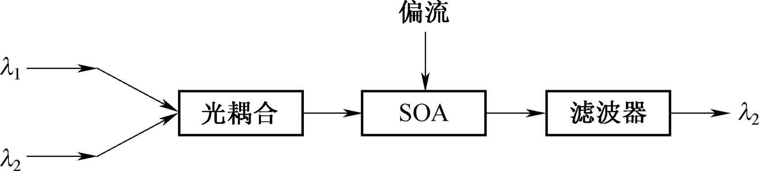 RFA主要由泵浦光源、光隔离器、合波器等组成,如图1-37 所示。泵浦光源产生 1 480 nm的泵浦光,经光隔离器后,与输入的信号光一起通过合波器耦合到一段光纤中。在这段光纤内利用受激拉曼散射效应使泵浦光能量向信号光转移,从而实现信号光的放大。