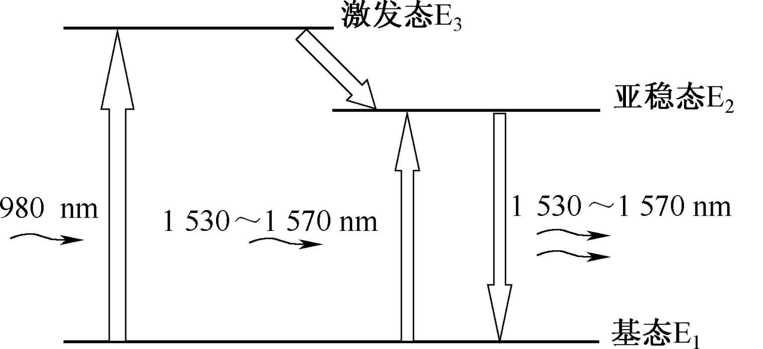 EDFA的工作原理是利用掺铒光纤中Er 3 + 离子的受激吸收和受激辐射实现光信号的放大。图1-36 为EDFA工作原理。Er 3 + 离子从低到高有 3 个工作能级:基态E 1 、亚稳态E 2 、激发态E 3 。Er 3 + 离子在未受到任何光激励情况下,处在最低能级E 1 上。当泵浦光源产生的980 nm或 1 480 nm激光不断地激发掺铒光纤,处于基态的Er 3 + 离子吸收泵浦光的能量后,从基态E 1 跃迁到激发态E 3 ,Er 3 + 离子在激发态E 3 不稳定,其存活寿命很短约 1 μs,很快以非辐射方式跃迁到亚稳态E 2 ,在亚稳态E 2 上Er 3 + 离子存活寿命较长可达 11 ms。由于泵浦光源不断激发,亚稳态E 2 上的Er 3 + 离子不断增加,基态E 1 上的Er 3 + 离子不断减少,形成了离子数反转分布状态。当波长为 1 530~1 570 nm的信号光通过掺铒光纤时,处于亚稳态E 2 上的Er 3 + 离子受激辐射跃迁到基态E 1 上,并且辐射出与输入光信号中的光子一样的全同光子,从而增加了信号光中光子的能量,实现了信号光在掺铒光纤中的放大。