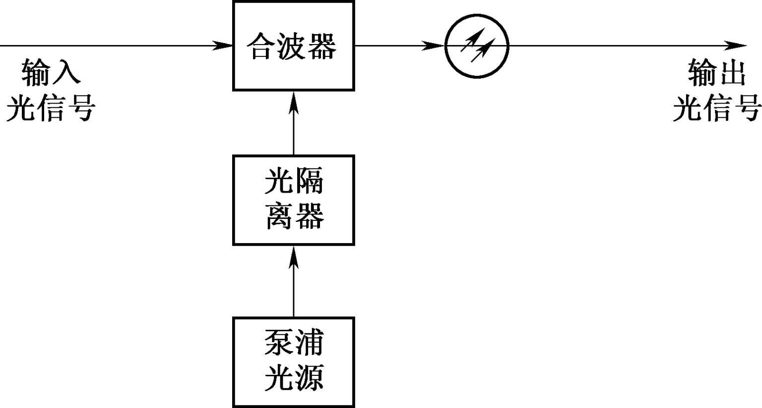 合波器将信号光和泵浦光合在一起送入掺铒光纤中。光隔离器抑制光反射,保证光信号只能正向传输,以确保光放大器稳定工作。光滤波器滤出剩余的泵浦光等的噪声,降低噪声对光纤通信系统的影响,提高系统的信噪比。