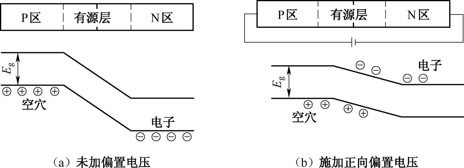 半导体发光二极管(LED)通常采用双异质结构,如图1-25 所示。当PN结上没有施加任何偏置电压时,电子与空穴中间隔着有源层,PN结两端的势垒较高,N型侧电子难以越过势垒,有源区几乎没有电子和空穴,器件处于热平衡状态。当在PN结两端加上正向偏压时,PN结两侧的势垒变小,有源层宽度变窄,大量电子与空穴进入有源层。电子受到外加电压的作用从低能级跃迁到高能级,形成粒子数反转分布状态。有源层的电子跃迁到价带与空穴复合,将多余的能量转换成光能,以光子的形式辐射出来,即自发辐射发光。
