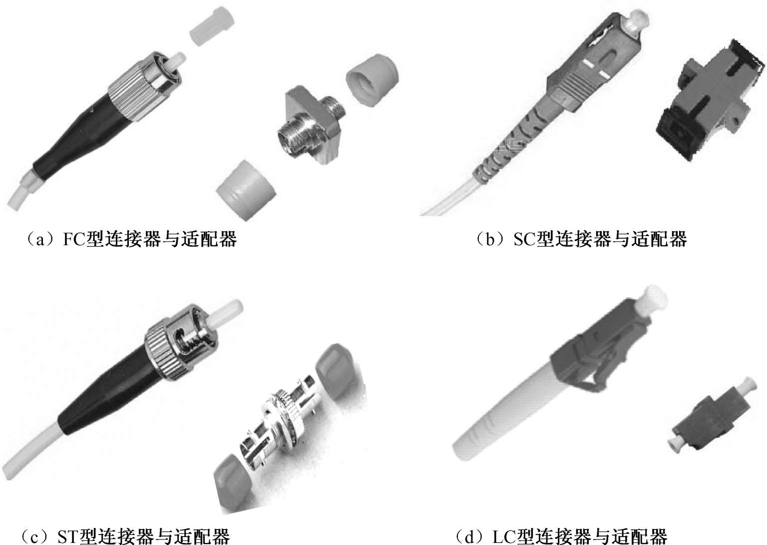 光纤连接器的种类很多,目前我国应用最广泛的是FC型、SC型、ST型和LC型连接器,如图1-4 所示。每种光纤连接器都有其对应的光纤适配器来实现光纤的连接。