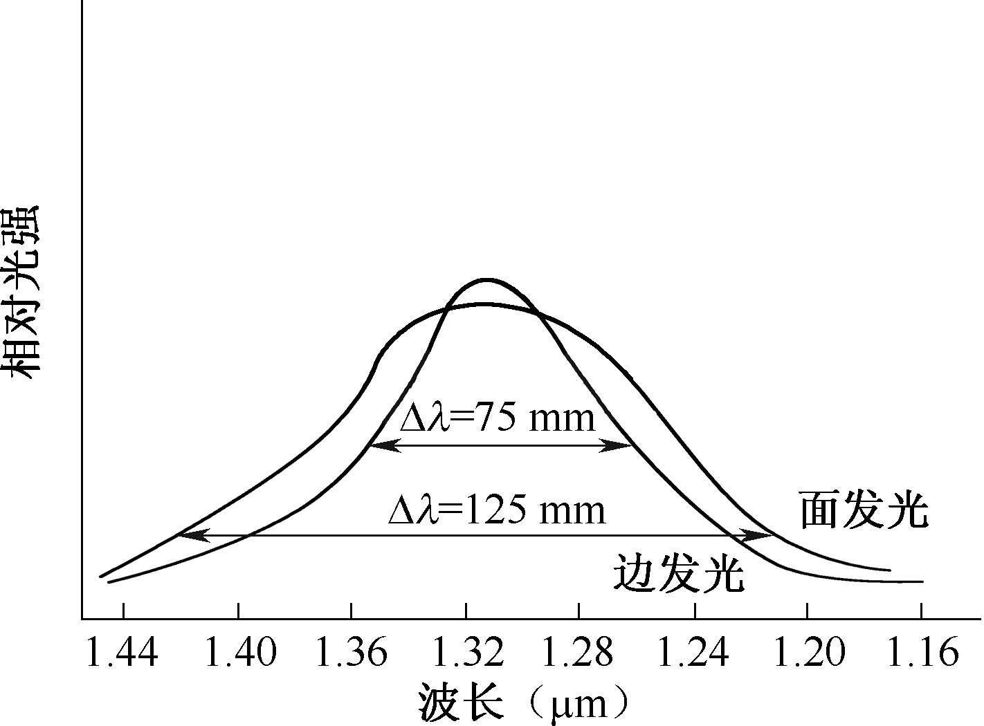 LED是非相干光源,发光以自发辐射为主,发出的是荧光,发光功率较小,光谱较宽,In-GaAsP-InP材料的LED谱线宽度一般为 70~100 nm,如图1-27 所示。这使得光信号在光纤中传输时色散较大。