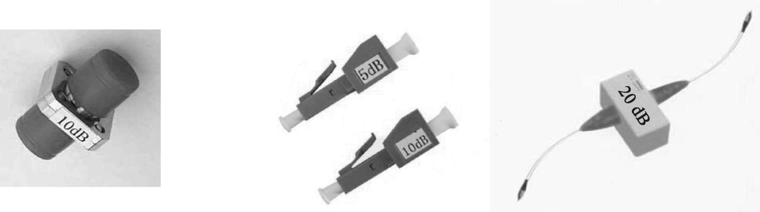固定光衰减器造成的光功率损耗值是固定不变的,具体规格有 3 dB、5 dB、10 dB、15 dB、20 dB、30 dB、40 dB等标准的损耗量,如图1-9 所示。
