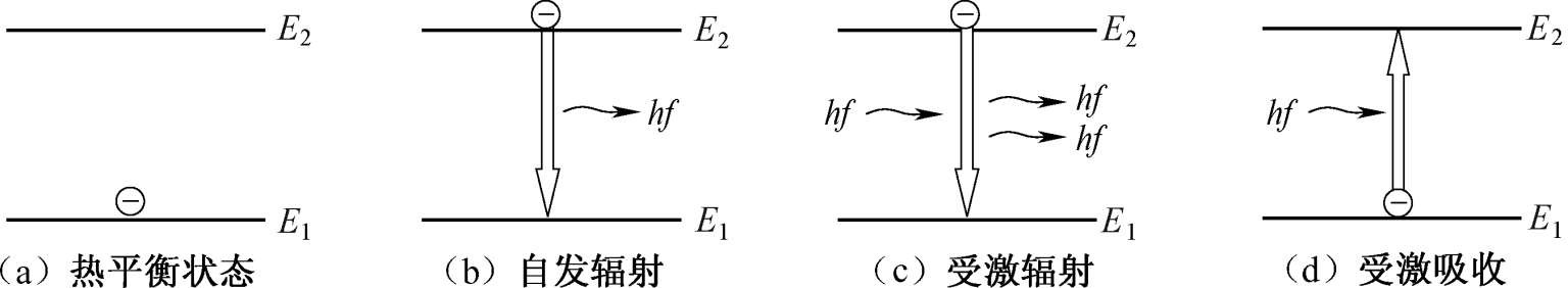 爱因斯坦根据辐射与原子相互作用的量子论提出,光与物质相互作用时,将发生自发辐射、受激辐射和受激吸收三种物理过程。图1-24(a)~(d)表示出光与物质作用的基本过程。