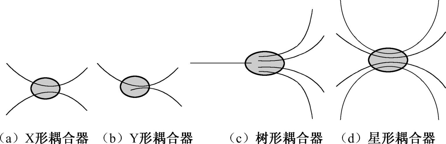 从端口形式上划分,光耦合器包括X形(2 × 2)耦合器、Y形(1 × 2)耦合器、树形耦合器以及星形( N × N , N > 2)耦合器等,如图1-12 所示。