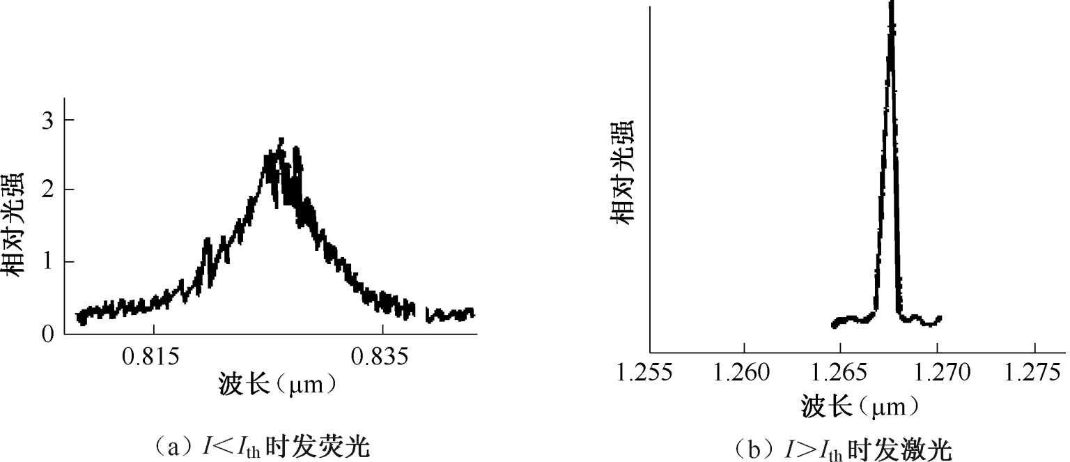 半导体LD的光谱随着注入电流变化而变化。当注入电流小于阈值电流时,激光器发出的是荧光,光谱很宽,相干性很差,如图1-31(a)所示;当电流大于阈值电流时,激光器发出的是相干的激光,光谱很窄,相干性很好,谱线中心强度急剧增加,如图1-31(b)所示。