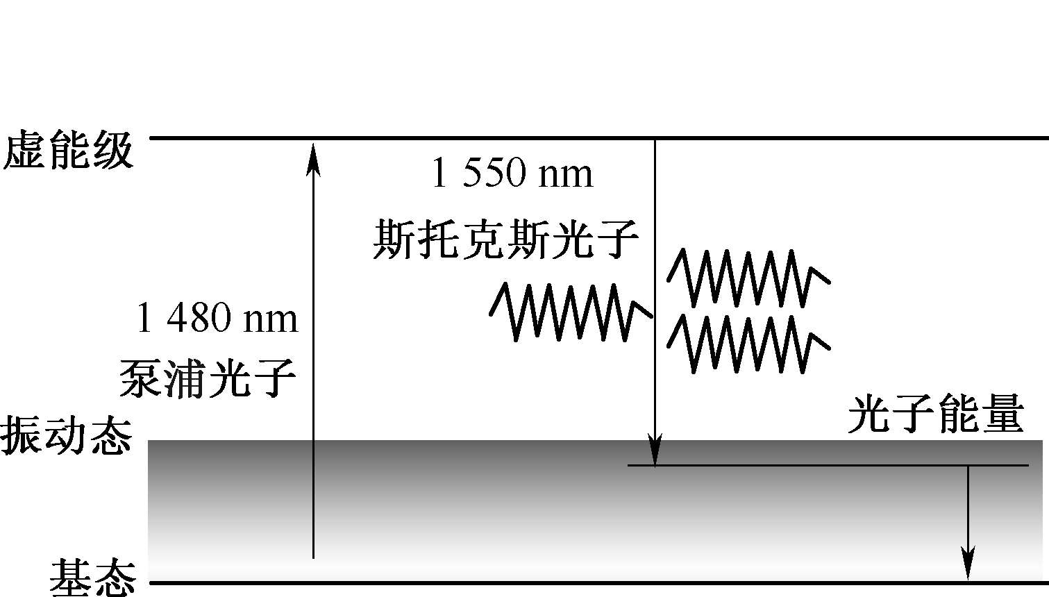 泵浦光子入射到光纤,光纤中电子受激吸收从基态跃迁到虚能级,虚能级的大小是由泵浦光的能量决定的。处在虚能级的电子在信号光的感应下跃迁到振动态能级,同时发出一种与信号光相同频率、相同相位、相同方向的光子,而剩余能量被介质以分子振动的形式吸收。
