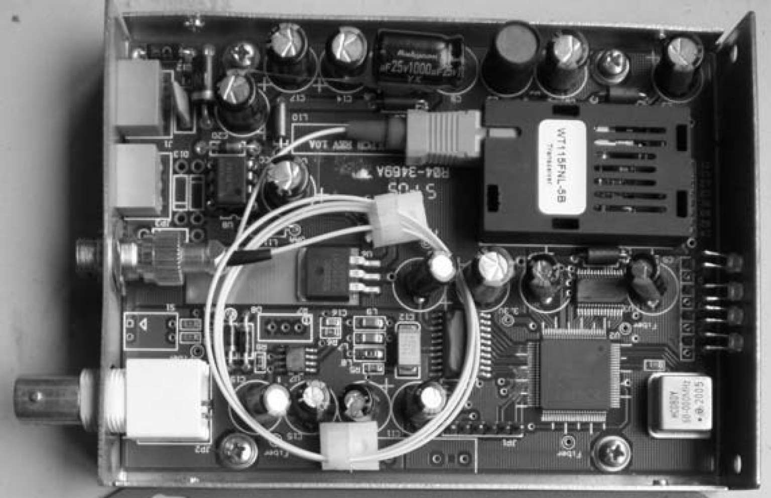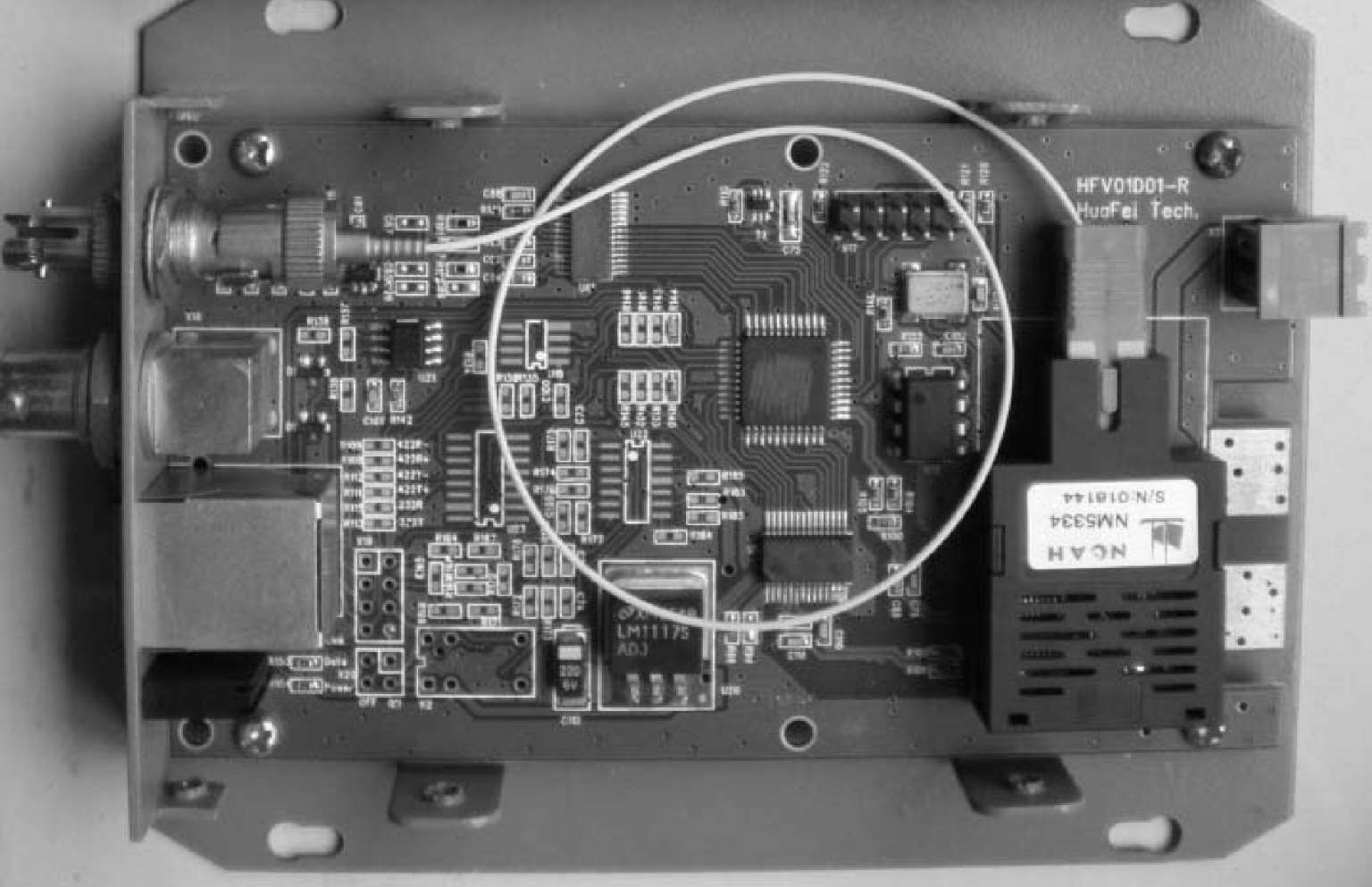图1-42 中虚线框内的电路属于光发送电路部分,虚线框外属于编码电路部分。最初许多厂家将两者分成不同的电路板来制作,随着集成电路的发展,生产企业将光发送电路和编码电路集成在一块电路板上制作。图1-43 所示为WTOS-02C型视频光发送机的电路,光发送电路和编码电路集成在一块电路板上实现。