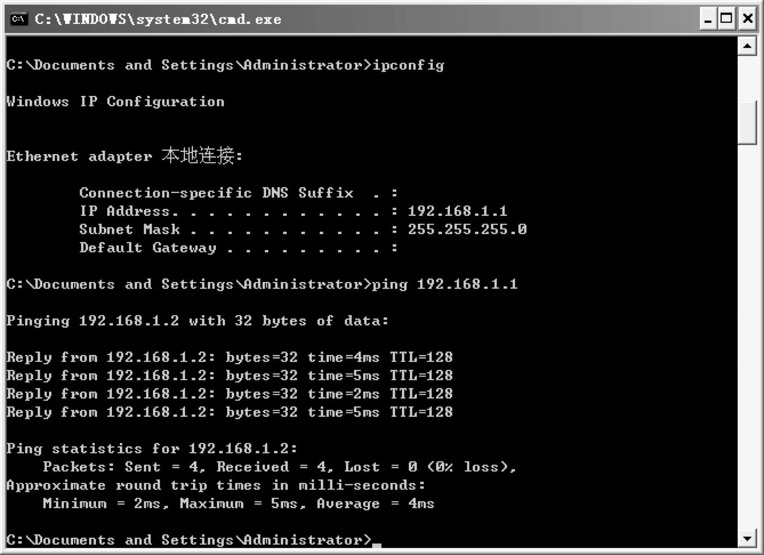 (8)将计算机的IP地址与网络摄像机的IP地址设置在同一网段(如摄像机的IP地址为192.168.1.2,计算机的IP地址为 192.168.1.1,子网掩码均为 255.255.255.0)。在计算机上Ping通网络摄像机的IP地址,如图1-59 所示。丢包率为0%(0% Loss),说明计算机与网络摄像机已联通。