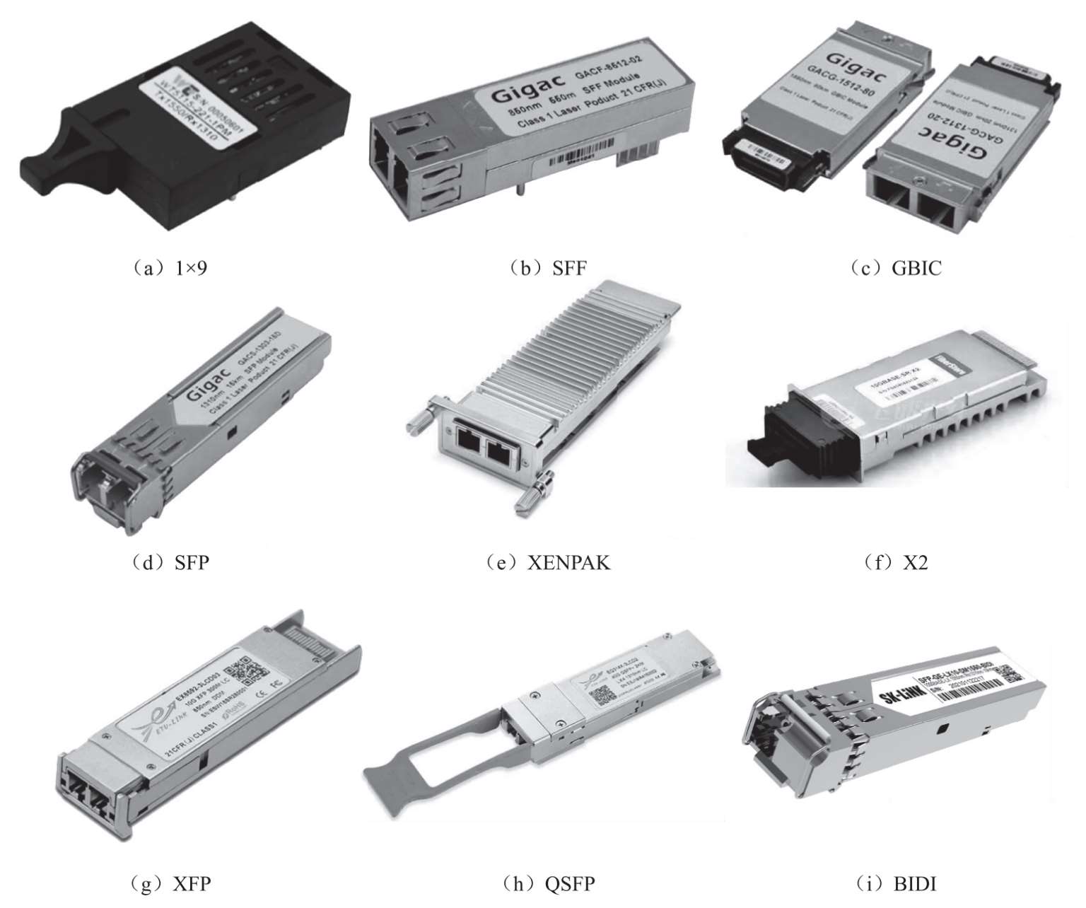 (2)光模块按照封装分为:1 × 9、SFF、GBIC、SFP、XENPAK、X2、XFP、QSFP、BIDI,各种封装如图1-56 所示。