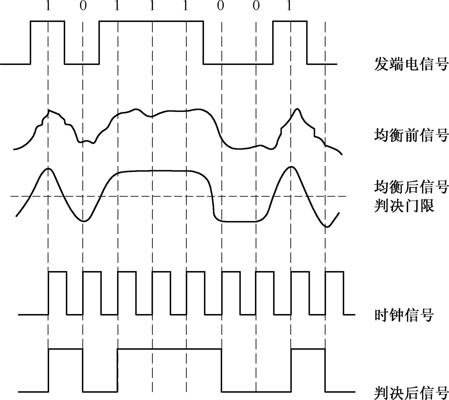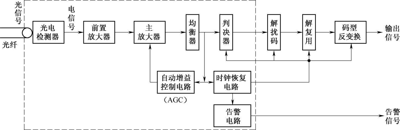 光接收机由光电检测器、前置放大器、主放大器、均衡器、再生判决电路和自动增益控制电路(AGC)等电路组成,如图1-45 所示。光发送机有扰码、复用和码型变换电路,为了实现信号的透明传输,光接收机还需有解扰码、解复用和码型反变换电路,还原与电发送端发出相同的数字电信号,送到电接收机。