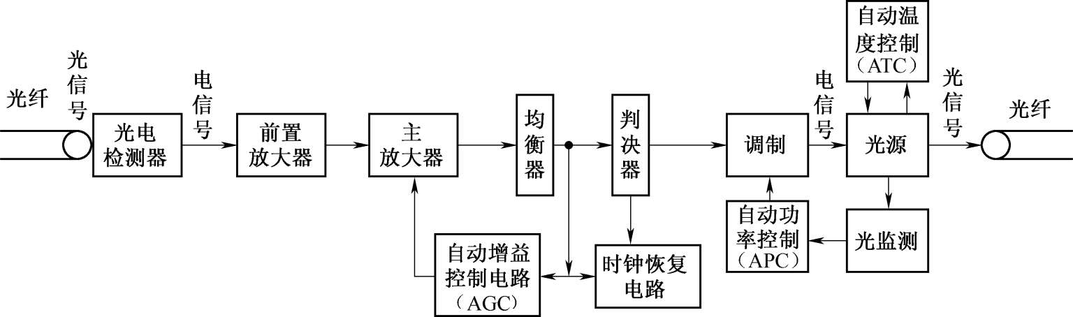光发送机发出的光信号在光纤中传输时,不仅幅度被损耗,脉冲波形被展宽,还夹杂着许多噪声。为了进行长距离的传输,需要每隔一定距离设置一个光中继器。光中继器的作用是补偿光信号的幅度损耗,对畸变失真的信号波形进行整形,恢复光信号的形状。