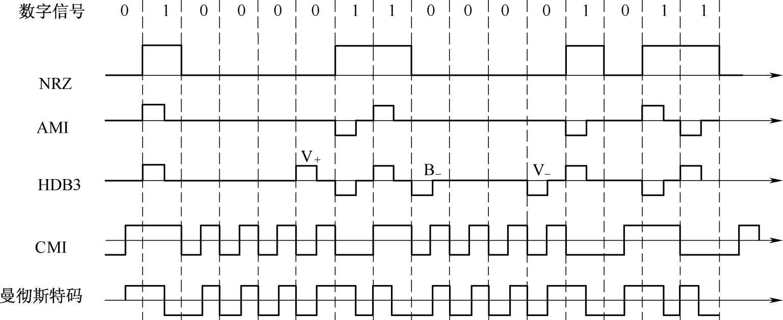 信号在传输线路上进行远距离传输时,需要使用不同的传输线路码型。常见的传输线路码型有单极性不归零码(NRZ)、单极性归零码(RZ)、双极性交替反转码(AMI)、高密度双极性码(HDB3)、传号反转码(CMI)、曼彻斯特码(双相码)等,如图1-41 所示。