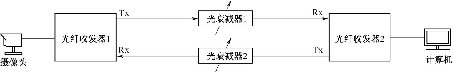 (1)任务分析:若摄像机与监视器之间的距离在 100 m以内可以采用网线直连。本任务中摄像机与监视器之间的距离为 10 km,需要采用光纤进行远距离传输,可通过组建点到点以太网光纤通信系统来实现,光端机的光信号和电信号速率可以相同,无需复用和解复用功能。选用HTB-1100S型以太网光纤收发器,用带光衰减器的光纤线路模拟 10 km光缆线路,用计算机的显示器作为监视器。