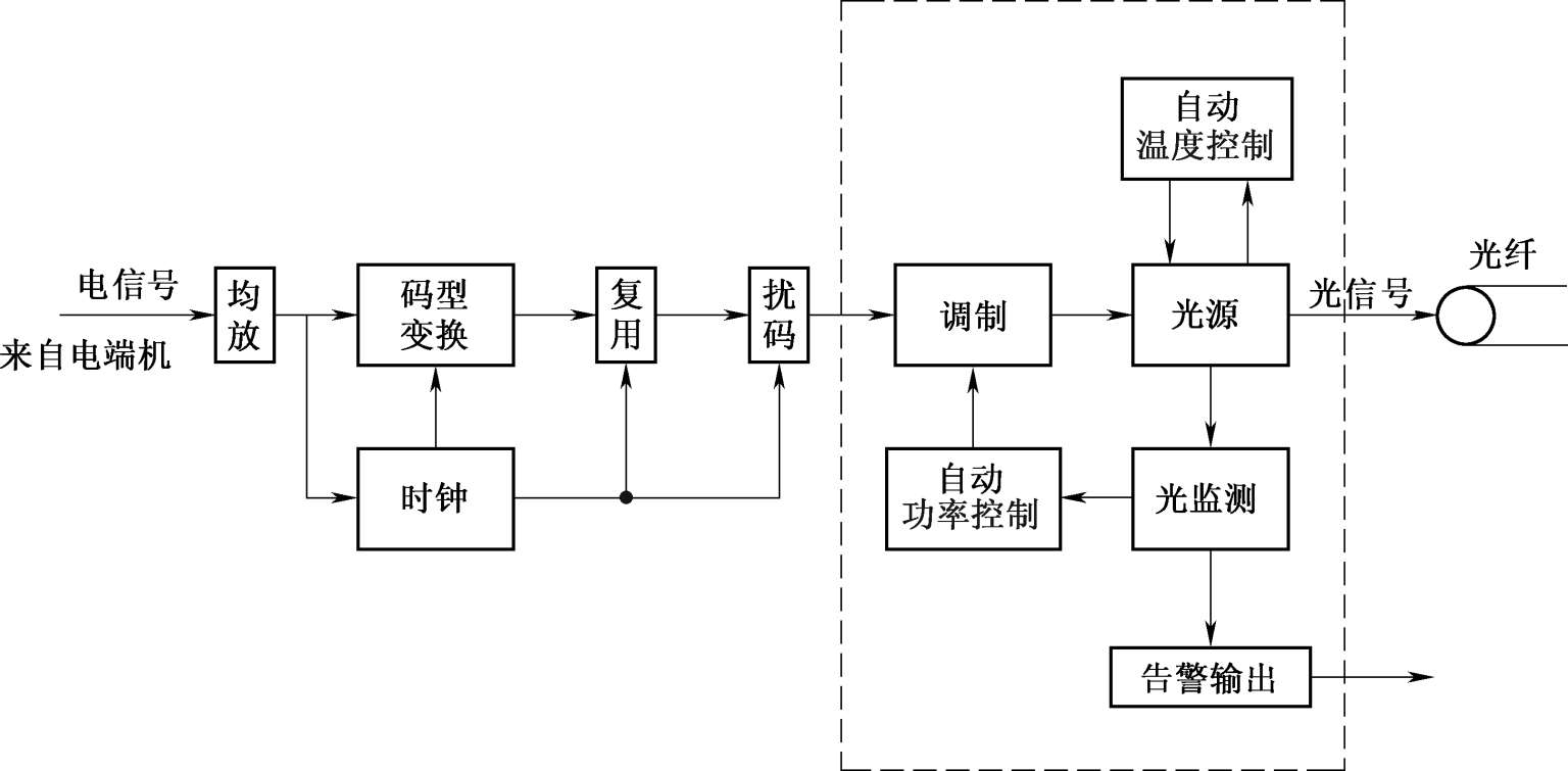 光发送机位于数字光纤通信系统的起始端,其作用是将电信号码流转换成光信号码流,具体做法是将数字化的电信号对光源发出的光波进行调制,成为已调光信号,然后将其耦合到光纤中进行传输。光发送机包括均衡放大、码型变换、复用、扰码、时钟提取、光源、光源的调制电路、自动温度控制电路(ATC)、自动功率控制电路(APC)、光源检测和保护电路等,如图1-42所示。