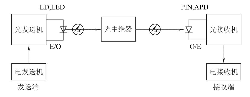 点到点光纤通信系统一般由光发送机、光中继器、光接收机、光纤线路组成。图1-40 所示为单向点到点光纤通信系统组成框图。双向光纤通信系统将光发送机和光接收机合在一起,称为光端机。