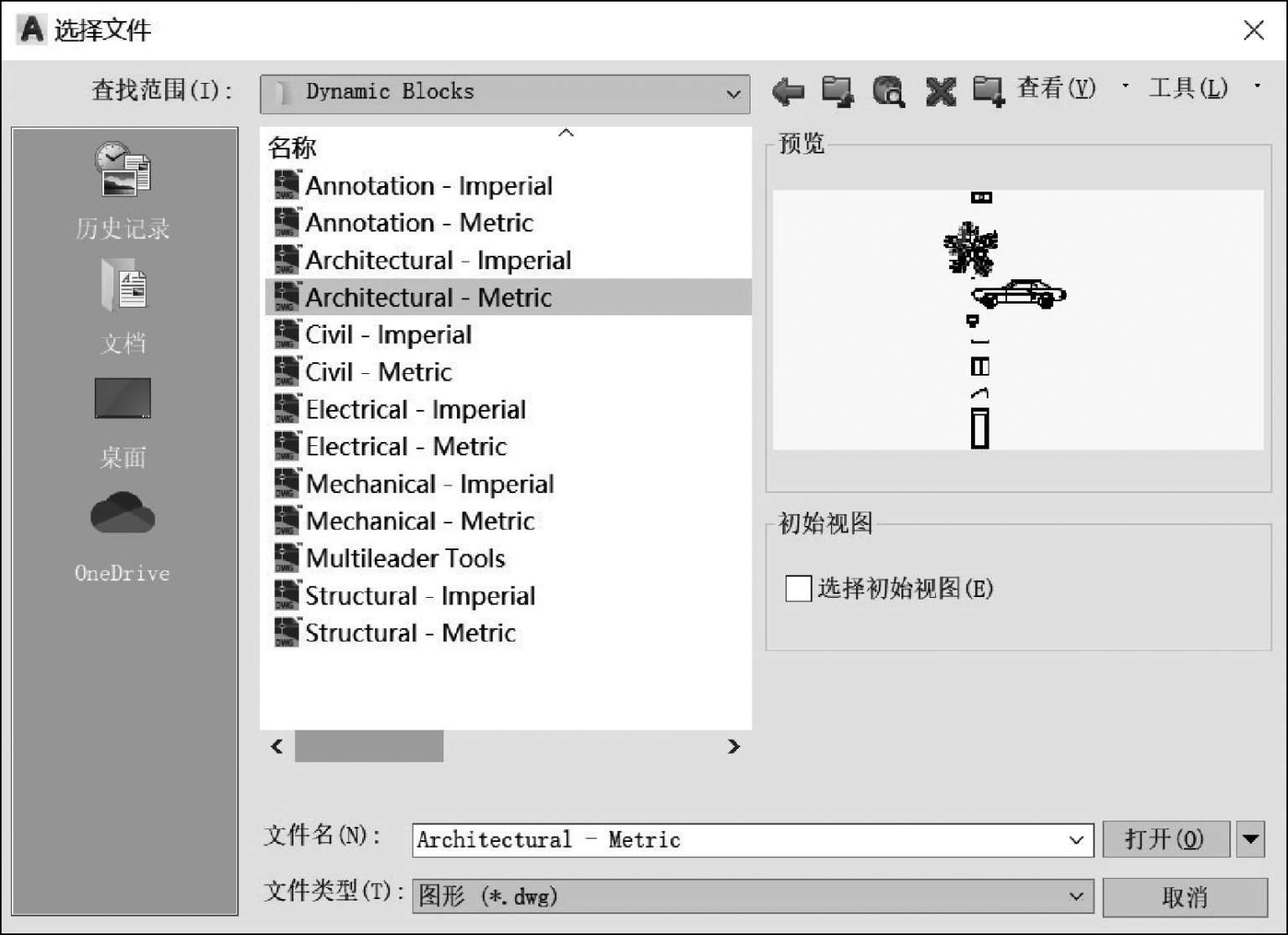 ②在弹出的“选择文件”对话框中选择文件所在路径,选中要打开的图形文件,如图1-14所示。