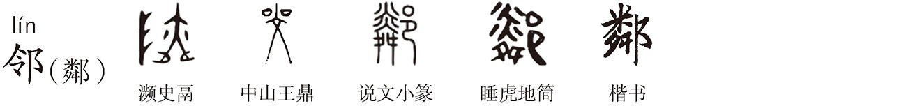 “邻”繁体作“鄰”,形声字。《说文》:“鄰,五家为鄰,从邑粦声。”本指古居民单位,五家为邻,五邻为里。张舜徽《约注》:“《释名·释州国》云:‘鄰,连也。相接连也。’鄰、连双声,皆密比之名。”邑为地方区域,本指封国,《说文》:“邑,国也。从囗;先王之制,尊卑有大小,从卪。”甲骨文“邑”作